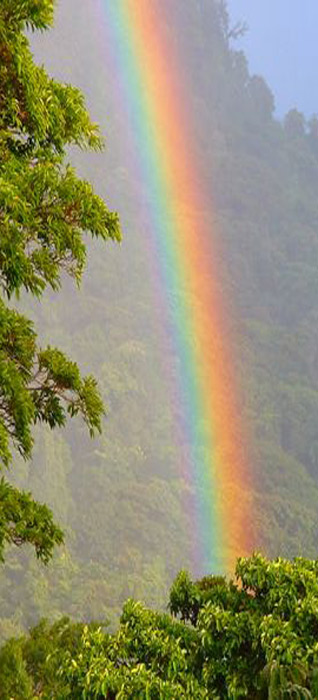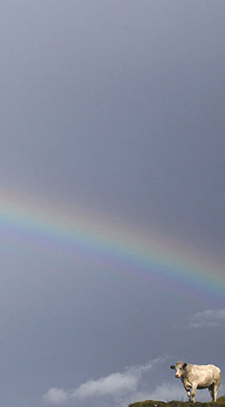 Then, as though someone had turned off a celestial faucet, it ended. A thin radiance spread out from the clouds, catching the tops of the trees. Every blade of grass was crystalline. A rainbow arched across the sky. But more than that: on our right was a pond, and in the pond was the end of the rainbow.